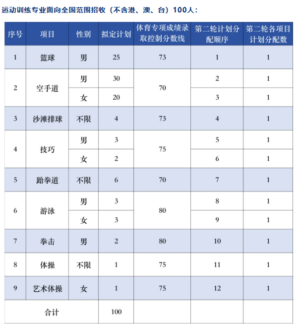 运动训练专业面向全国范围招收(不含港、澳、台)100人: